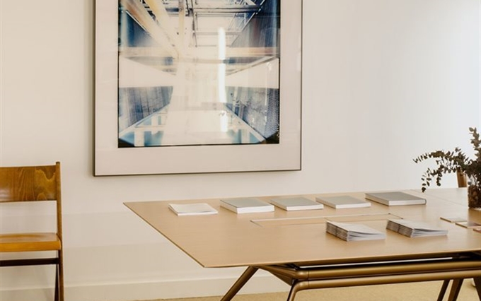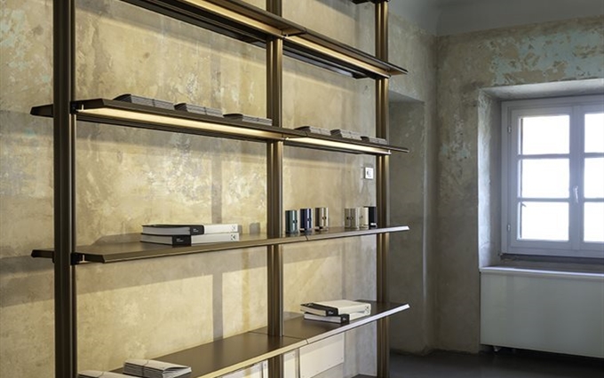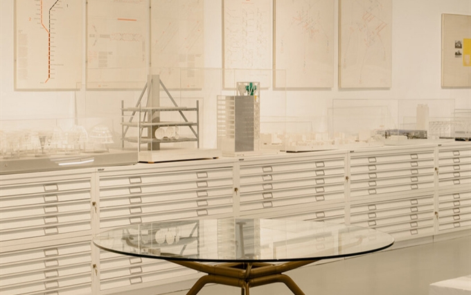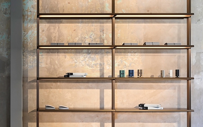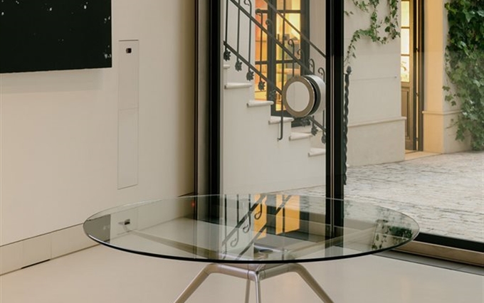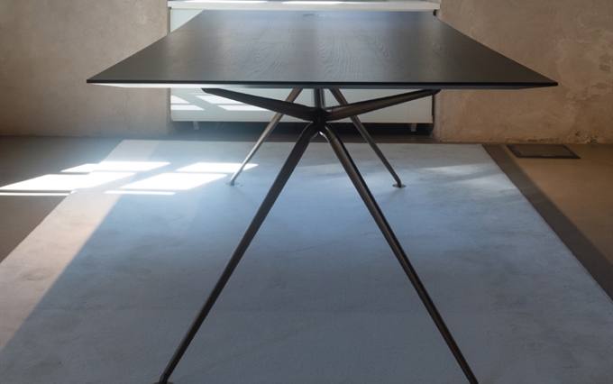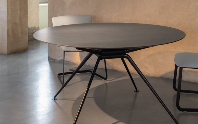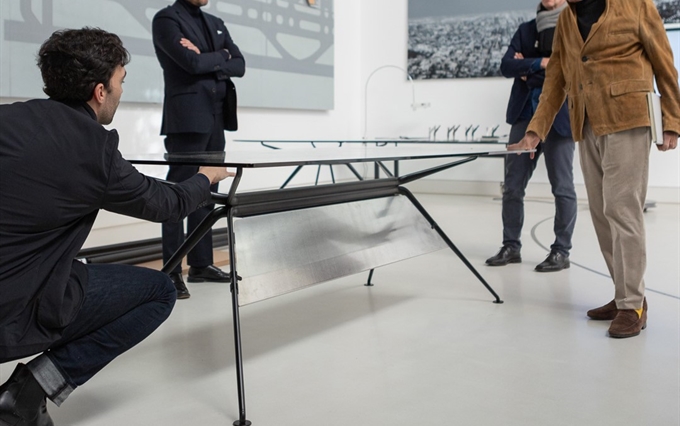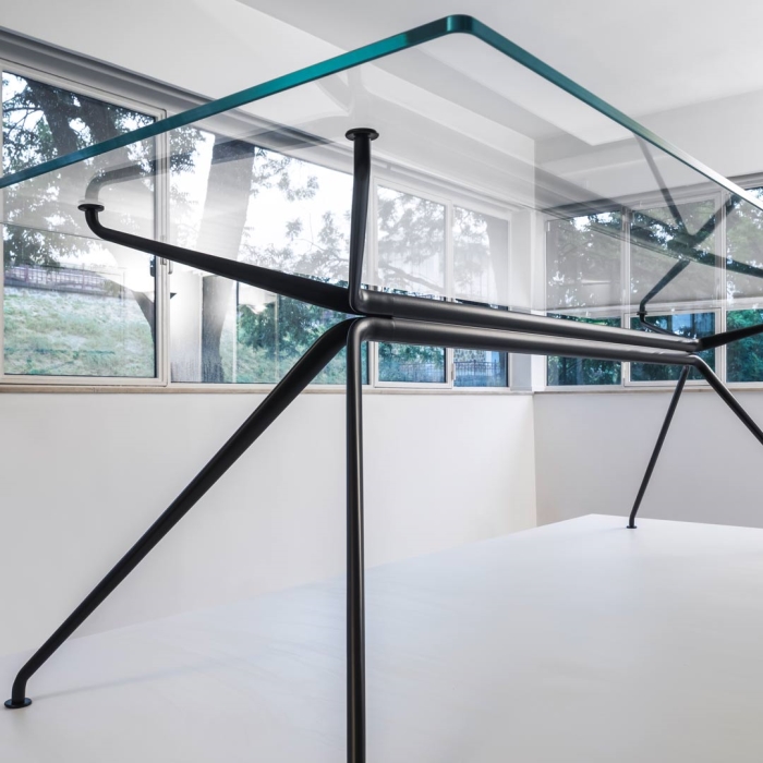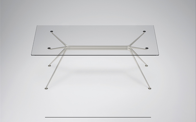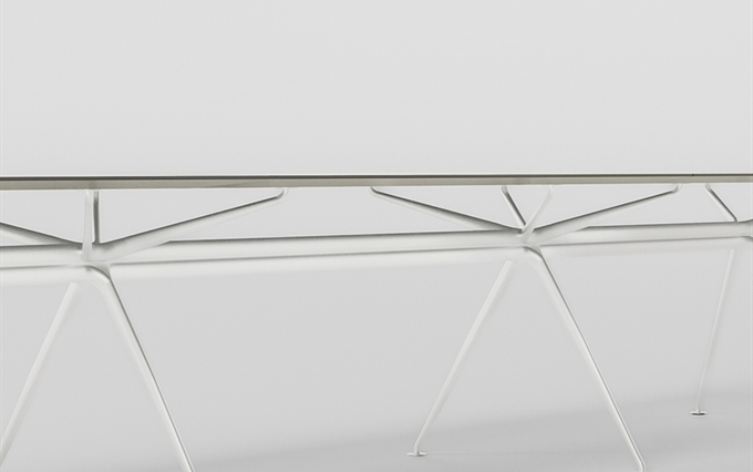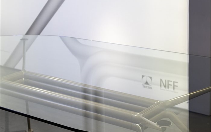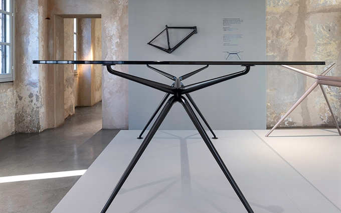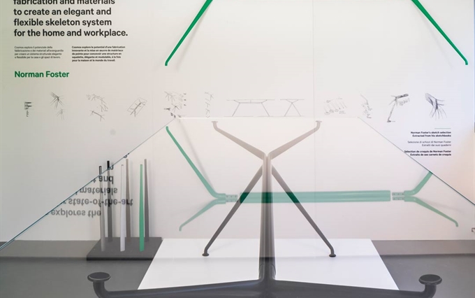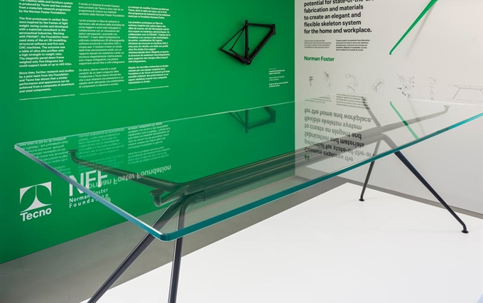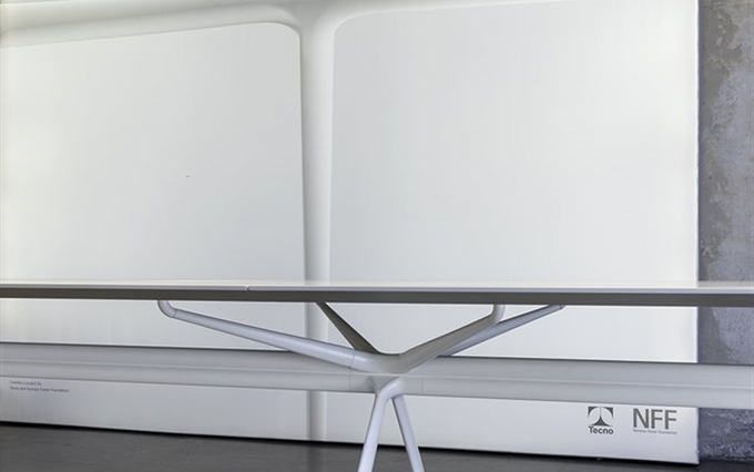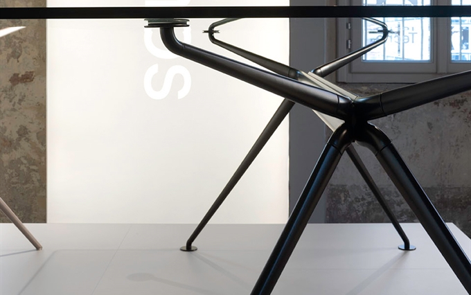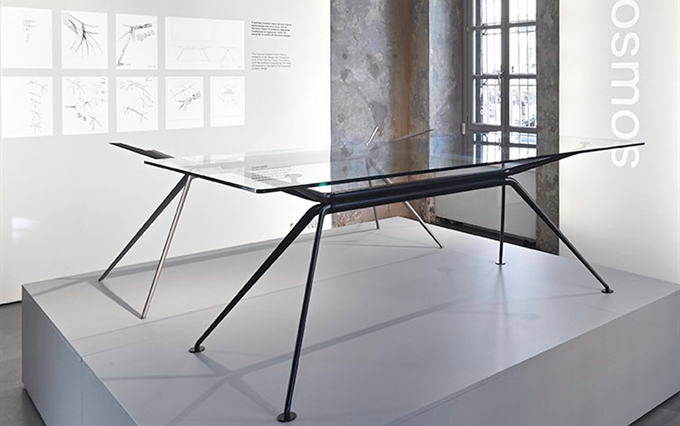 Design: Norman Foster. L'estetica di Cosmos nasce dall'eccezionale forza della struttura portante, con il suo gruppo di quattro ellissi che si ramificano, come un albero, nelle gambe e nei supporti superiori. Seguendo la massima del "fare di più con meno", il sistema è caratterizzato da un numero minimo di componenti, che si innestano l'uno nell'altro. L'ispirazione di estensione del potenziale strutturale dei metalli e dei compositi è tratto dal profilo slanciato dei telai delle biciclette da corsa e dalle forme smussate degli alianti ad alte prestazioni. Attraverso un processo di modellazione e lavorazione, il sistema è stato perfezionato in alluminio riciclabile per raggiungere la massima sottigliezza e leggerezza arrivando ad una grande capacità di carico.