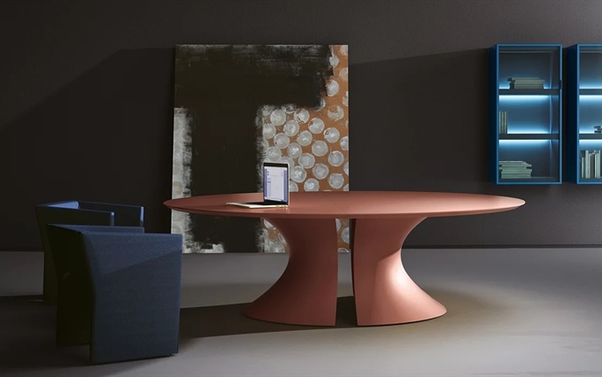 Ola è una linea di arredi, pluripremiata, caratterizzata da un segno distintivo, la conchiglia, generata dalla forma ad ellisse della base che ne disegna la forte personalità. Particolare è l’utilizzo di un materiale innovativo per il basamento: il Cristalplant. L’uso contrapposto di due basamenti offre la possibilità di posizionare un ampio piano, ideale per i meeting. La torretta di elettrificazione è estraibile ed in alluminio. Con Ola è possibile realizzare tavoli riunioni diversi dal solito stile formale grazie all’uso di colori moda. Piani in vetro temperato o in MDF laccato. Cassettiere, mobili di servizio, contenitori pensili, in varie dimensioni, nelle stesse finiture dei tavoli. Piani laccati opachi o lucidi, in vetro laccato oppure bicolore, ampia scelta di colori sia per i piani laccati che in vetro. Basamento colore nero opaco, oppure lucido bianco o nero.