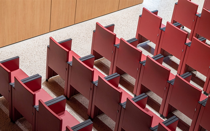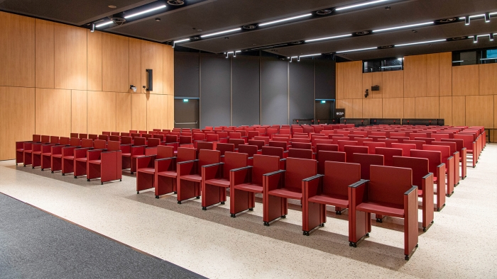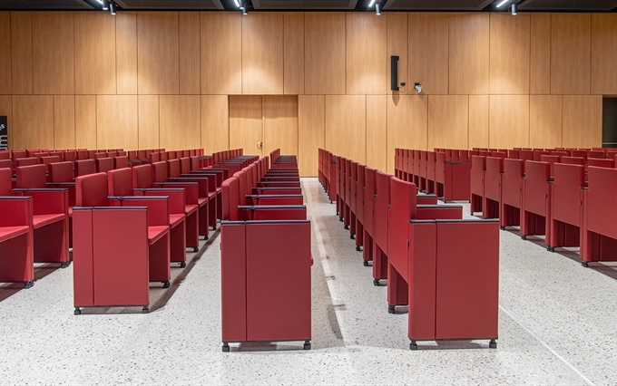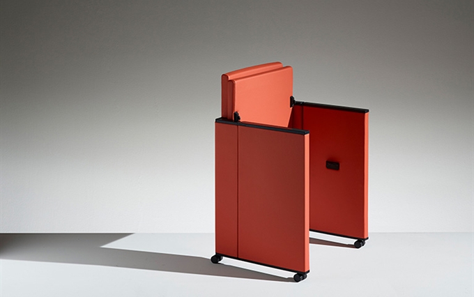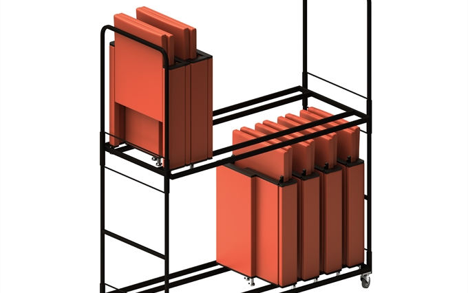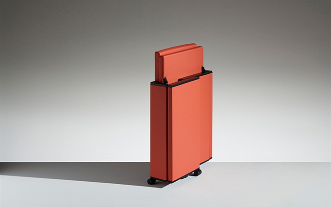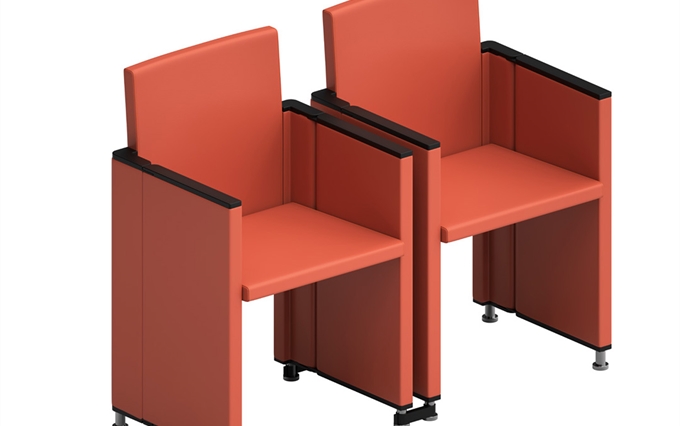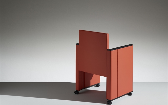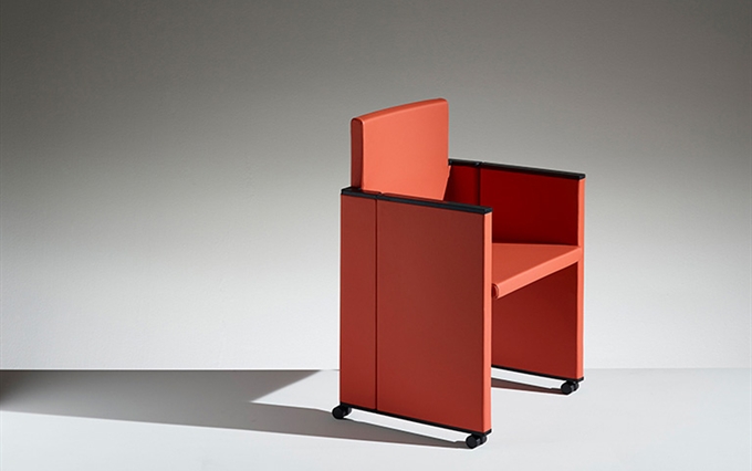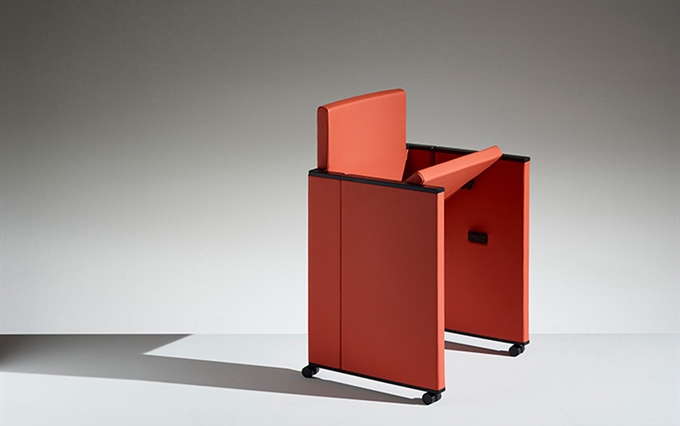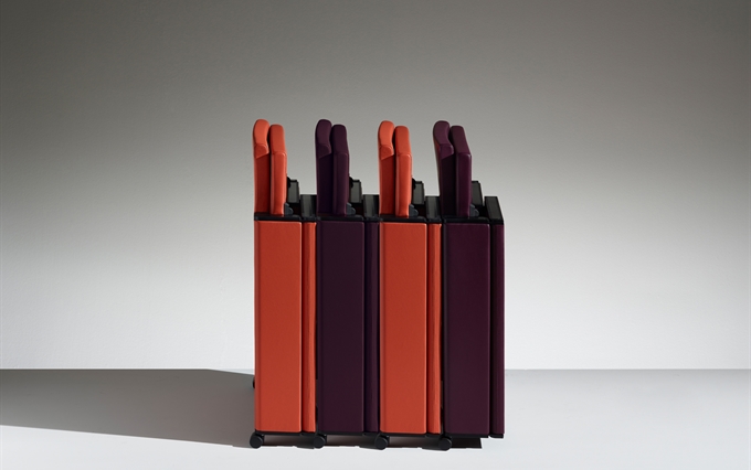 • Poltrona di nuova concezione per ambienti polifunzionali, caratterizzata da un esclusivo sistema di movimenti che, pur mantenendo elevati livelli di comfort, permettono a sedile e fiancate di ripiegarsi in sovrapposizione sullo schienale riducendo lo spessore complessivo a soli 20 cm, per essere facilmente spostata e conservata dopo l’utilizzo.